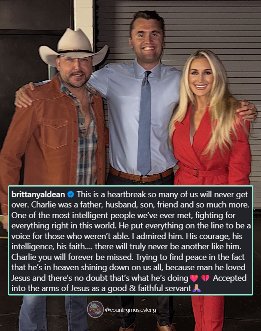 Some moments stop the world in its tracks — not because of headlines, but because of heartache that runs deeper than words can carry. The sudden and tragic death of Charlie Kirk, a man whose voice stirred debate and inspired thousands, sent shockwaves through the country. And among those left reeling are two familiar voices who chose not to stay silent: Jason and Brittany Aldean.