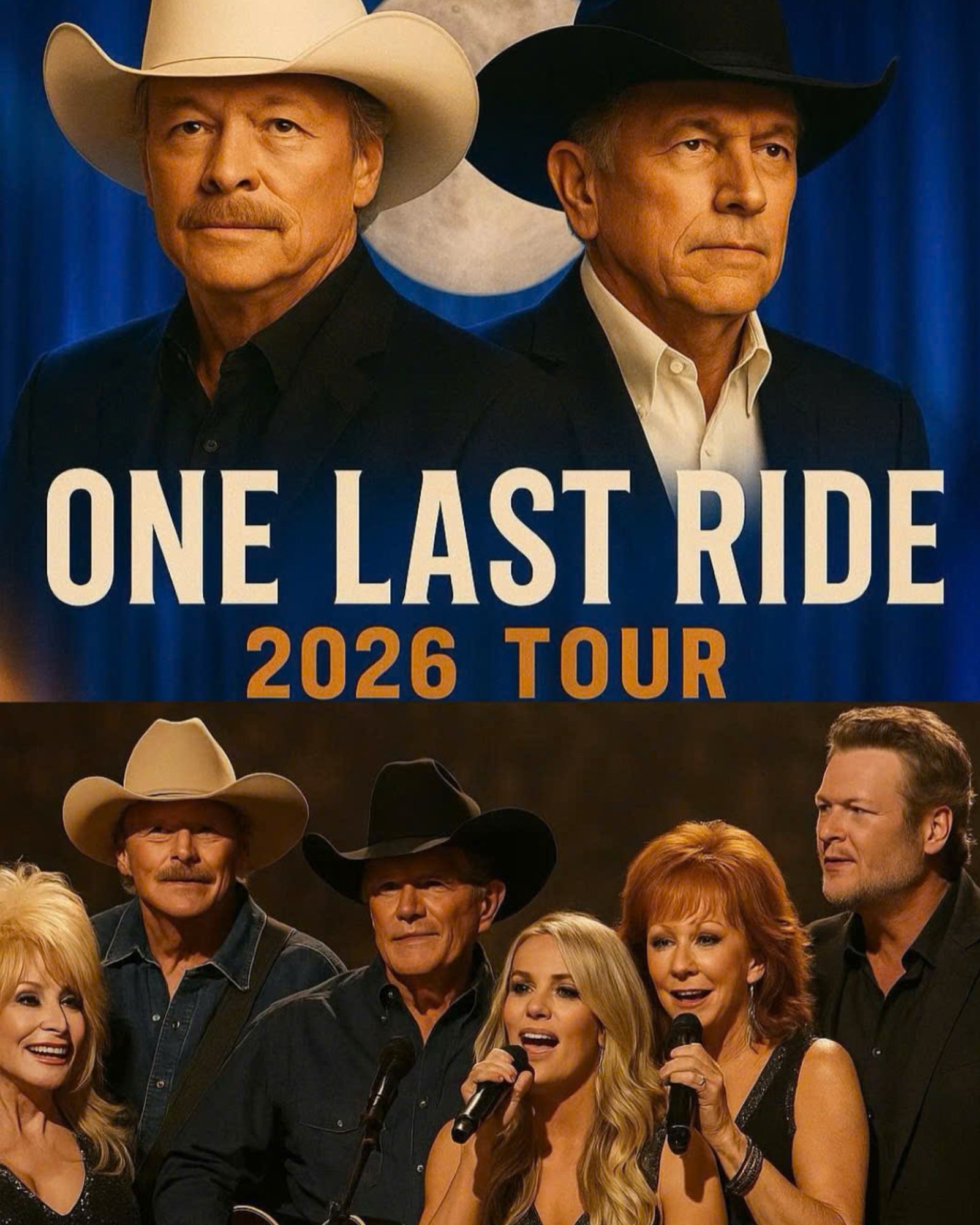 The country music world is abuzz with excitement as six of its greatest living legends — Dolly Parton, Alan Jackson, George Strait, Carrie Underwood, Reba McEntire, and Blake Shelton — have announced the 2026 “ONE LAST RIDE” Tour, a historic collaboration set to honor the past, electrify the present, and inspire the future of the genre.