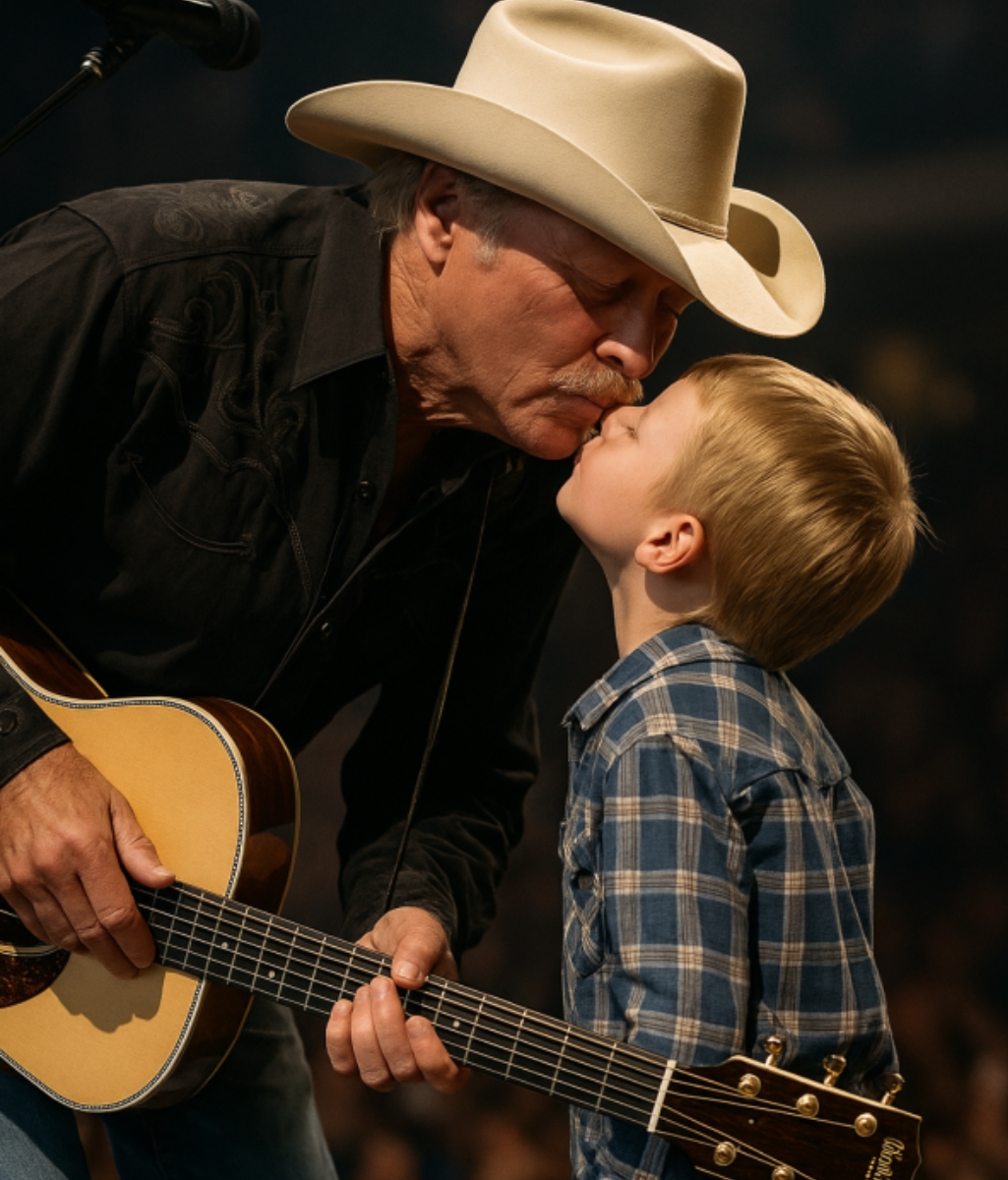 From the wings came a small figure — his young grandson, eyes wide under the glow of the stage lights, clutching a miniature cowboy hat just a bit too big for his head. Without a word, Alan Jackson knelt beside him, gently placed a hand on the boy’s shoulder, and leaned in close.