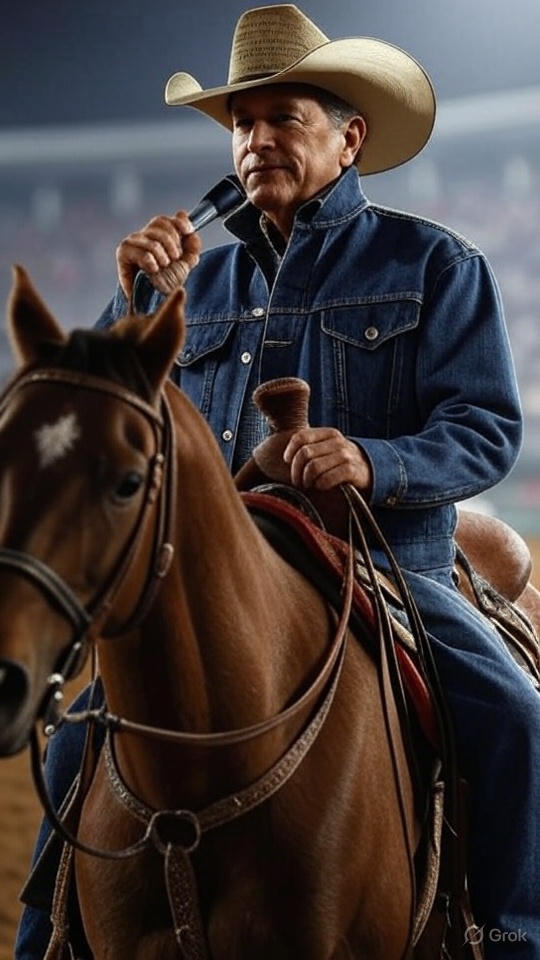 This isn’t a music video. It’s not a promo shoot or a glossy magazine spread. This is George Strait—unfiltered, unshaken, and completely at home. No lights. No smoke machines. No stage tricks. Just a man. His horse. And the dust of a Texas rodeo clinging to his boots. He’s not just the King of Country. He’s the real thing—a cowboy in every sense. He doesn’t just sing the Western way of life. He lives it. Whether he’s in front of 70,000 fans or riding under a lone star sky, George brings the same quiet strength, the same worn-in honesty, the same grace that’s carried him through four legendary decades. Hat tipped low. Microphone in hand. His voice steady. He’s not performing—he’s paying tribute to the land, the people, and the spirit that made him. And in that stillness, you don’t just hear a song. You feel the heartbeat of Texas. And the soul of a man who never left it behind.